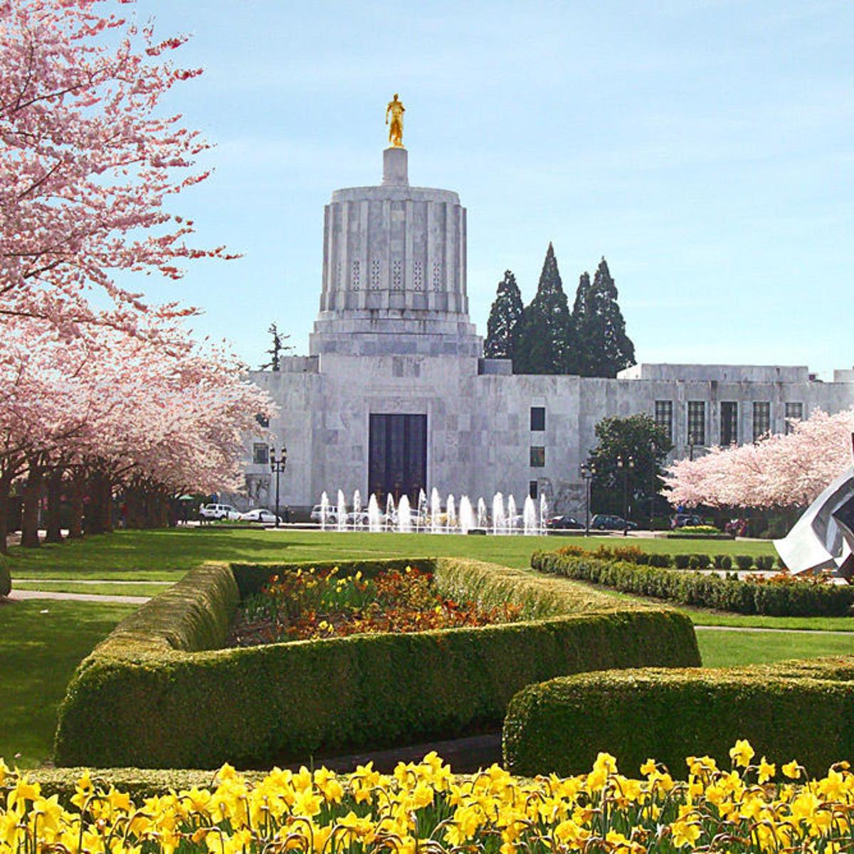 State Of Oregon Capitol With Golden Pioneer Statue Oregon Woodsmen Tree Service